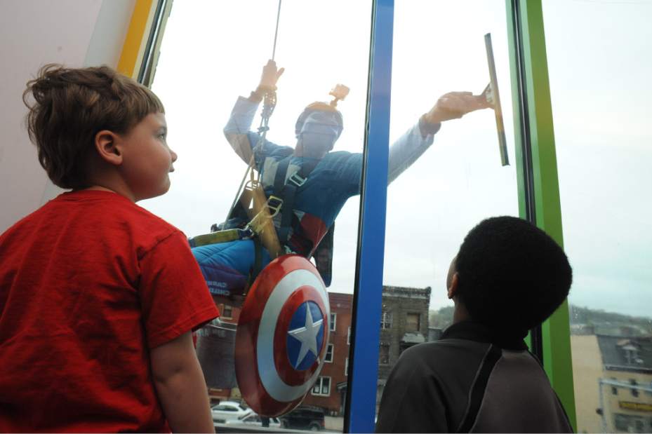 Trailed by news crews, photographers and hospital media gurus, the foursome from Allegheny Window Cleaning Inc. of Springdale brought newfound celebrity to their rounds at Penn Avenue and 45th Street in Lawrenceville. More than a half-dozen other children’s hospitals across the country have adopted the idea since Allegheny Window workers suited up last fall as Batman, Captain America, Spider-Man and Superman.