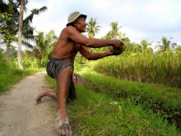 A stranger offers us coconuts as sustenance on a biking trek through rural Bali – but raising the question of the reliance of subsistence farmers on handouts of passing tourists
