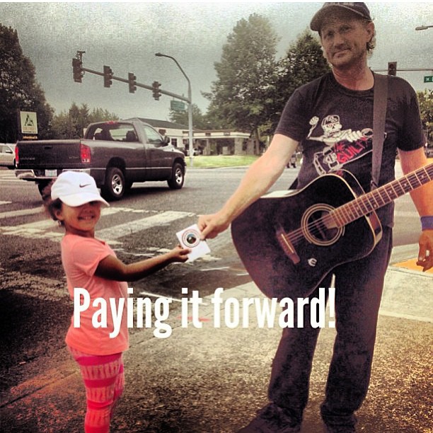 @jessicagilmartin wrote: “I see this man on the corner daily and he’s always sharing his music and Bella always asks about him. So today I taught her how to pay it forward. We gave him a $15 gift card to Chuck’s Produce. He told her that she made his day and saved him. She gave him a hug and said bless you.”