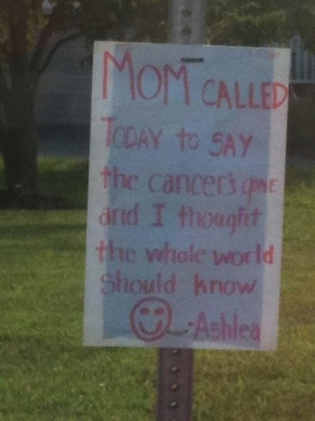 girl writes a sign to celebrate her mum getting the all clear from cancer