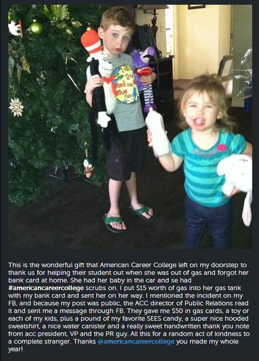 Well, the nice people at the American Career College were made aware of Staci’s act of Kindness and they responded.