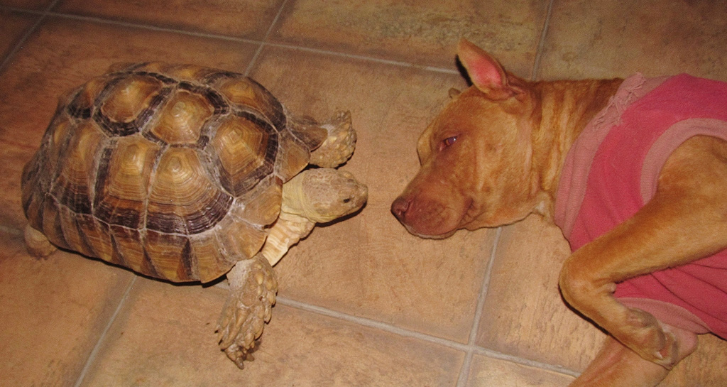 Crouton the African Sulcata tortoise not as happy about sharing here.