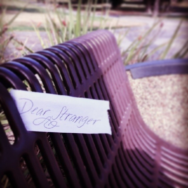 “random acts of kindness are contagious. On my lunch break today I walked to the nearby cemetery and left a letter to a stranger on a bench.”