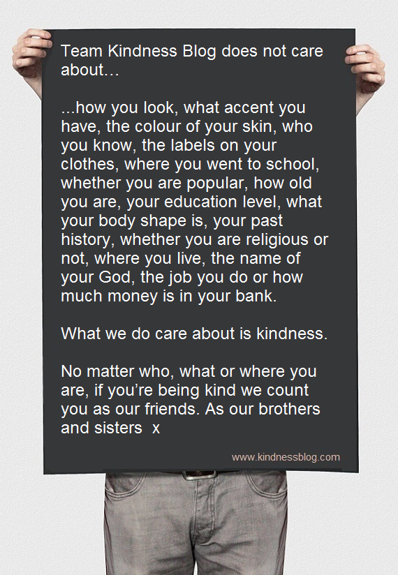 Well guess what you amazingly gorgeous creator’s of the kindness blog!? It is because of those word’s above and your heartfelt intention to bring the essence of kindness to this planet everyday that I do believe…that ‘I’ have become a better person…this blog remind’s me to start with ‘The man (or in my case woman) in the mirror’ everyday…it’s actually become addictive!…asking myself the question as my feet hit the floor each morning…’Now…how can I show kindness today?’ so anyhoo….Thank you!