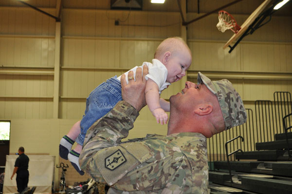 Specialist Ryan Tremble meets his 9-month-old daughter, Jade.