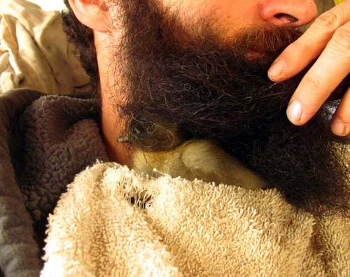 Because ducks are quite social animals he knew that the baby would only survive if it learned the crucial social skills. Mother ducks keep their kids underneath their wings to keep them warm, so this inventive man decided his beard would be the next best thing!