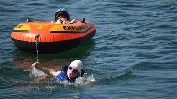 On July 12, Noah was nervous as the big event began. For the swimming portion, he had a harness around his chest that was attached to an inflatable raft that held Lucas. He swam 200 meters, then biked for three miles while pulling Lucas in a bike trailer, and finally ran one mile while pushing Lucas in the special buggy.