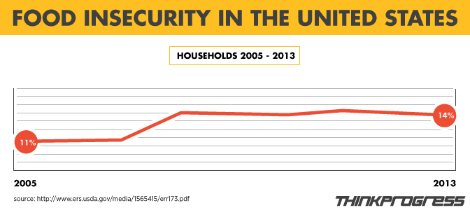 There has been a sharp rise in hunger across the country since the recession, with the share of households experiencing food insecurity, or the inability to afford adequate food, at 14 percent last year, or 17.5 million families. That’s an increase from just 11 percent between 2005 and 2007. And more than one in five children lived in a food insecure household in 2012. While most food insecure families can keep eating by buying very basic foods, 6.8 million households had at least one family member who had to eat less, and 765,000 children lived in those households last year. These bouts of food insecurity hit families for an average of seven months out of the year and for a quarter they happened almost every month.