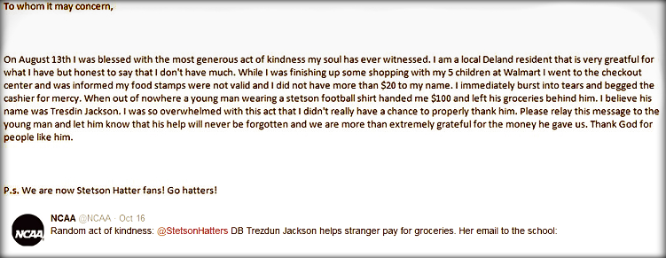 Stetson football player gives stranger at Wal-Mart $100 to buy groceries