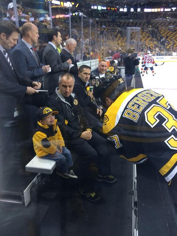 Before the game Tuesday, Liam was given a seat next to the bench. His affection for the Bruins, and their and their affection toward Liam, did the rest. Liam and Bergeron also had their own mini-reunion.