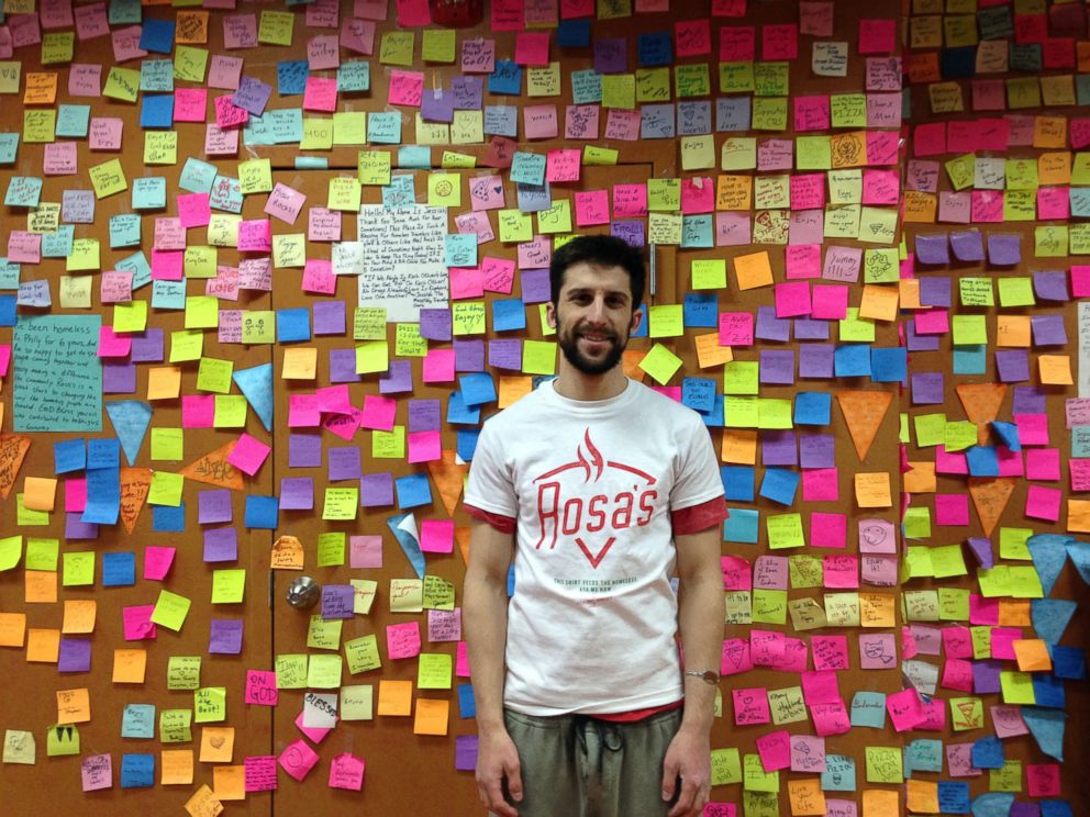 Now, some 8,000 slices later, whenever someone hungry comes in – they can just grab a post it off the wall to pay for their meal. The post-its share inspiring messages of motivation or gratitude, such as “you can do it” and “you are beautiful.”