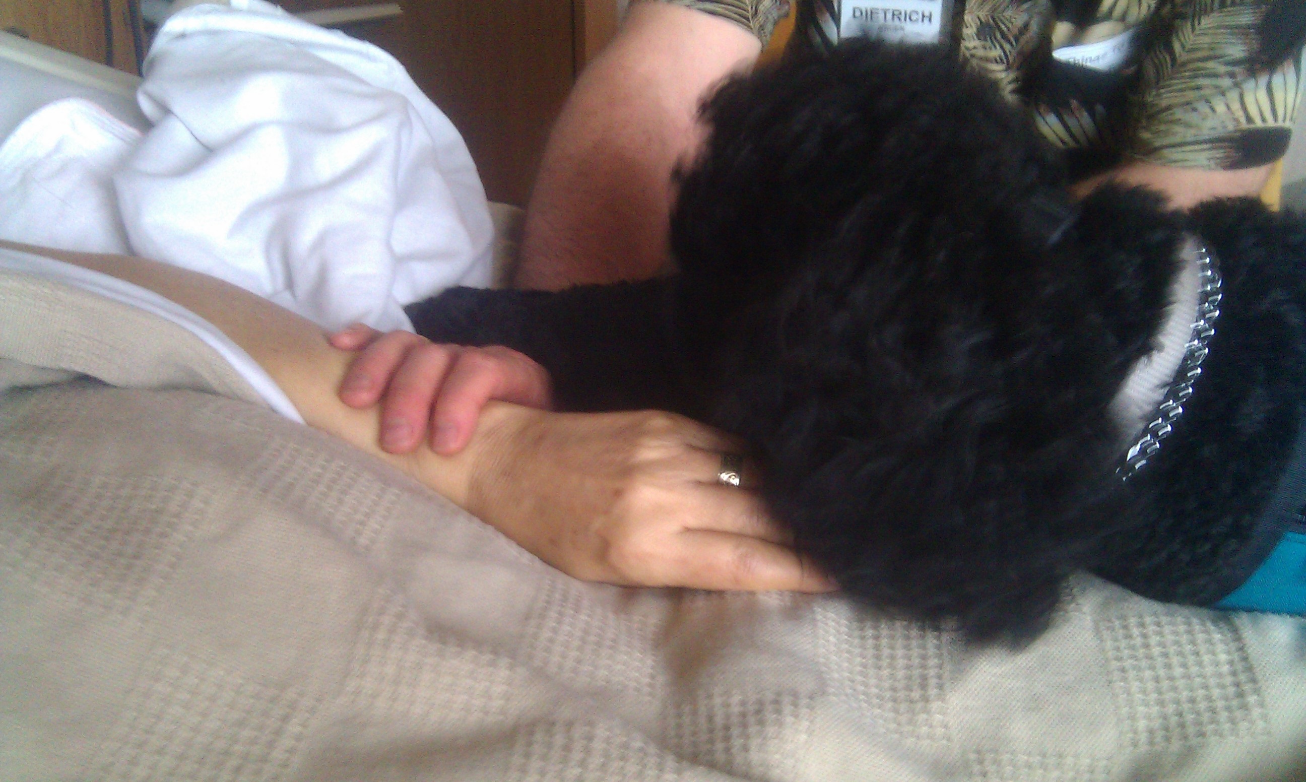 Once at her bedside, Candy instinctively rose up on her hind legs, then slowly slid forward to nuzzle with her snout probing this woman. Candy then leaned forward onto the hospital bed, fully extending her torso to cuddle, while maintaining two feet on the floor at all times, as good dogs (and people) do. Our beloved black poodle maneuvered to grab the woman’s hand, with her paws, as in prayer.
