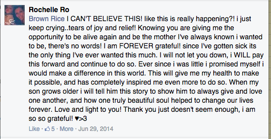 I responded: “Brice, I CAN’T BELIEVE THIS! Iike this is really happening?! i just keep crying..tears of joy and relief! Knowing you are giving me the opportunity to be alive again and be the mother I’ve always known i wanted to be, there’s no words! I am FOREVER grateful! since I’ve gotten sick its the only thing I’ve ever wanted this much. I will not let you down, i WILL pay this forward and continue to do so. Ever since i was little i promised myself i would make a difference in this world. This will give me my health to make it possible, and has completely inspired me even more to do so. When my son grows older i will tell him this story to show him to always give and love one another, and how one truly beautiful soul helped to change our lives forever. Love and light to you! Thank you just doesn’t seem enough, i am so so grateful! ♥>3″