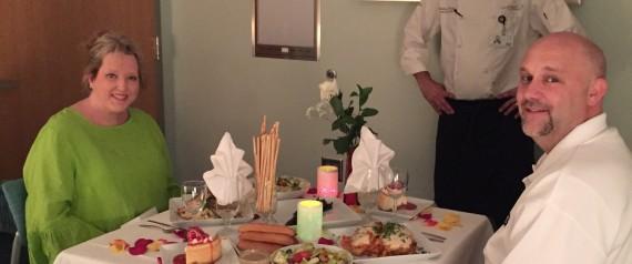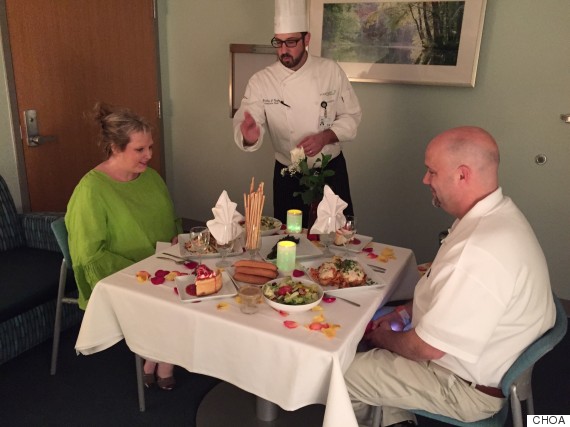 A group of volunteers transformed an ordinary conference room into a “private restaurant,” where the hospital’s own Chef Bradley served some of the couple’s favorite dishes over candlelight.