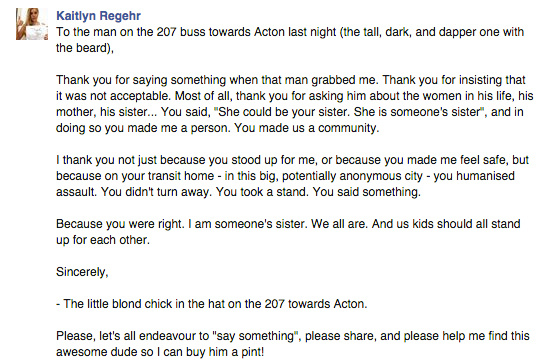 A young student has posted a public message on social media with the aim to track down the man who defended her against a sexual harasser on a London bus.