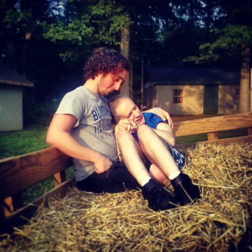 (20) The man on the left, Tully, is holding a 46-year-old, wheelchair bound man with severe mental handicaps.Tully picked him up so he could go on the hay ride with everyone else.
