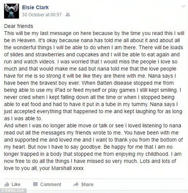This October 29th, Marshall wrote in his last letter to his loved ones that he will be in heaven sliding down “loads of slides,” eating strawberries and cupcakes, running around and watching his favorite videos.