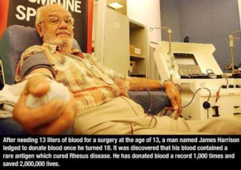 James Harrison was born in 1936. At the age of 13, he underwent major chest surgery, requiring 12 litres of blood. After surgery, he was in the hospital for three months. Realising the blood had saved his life, he made a pledge to start donating blood as soon as he turned eighteen, the then required age.