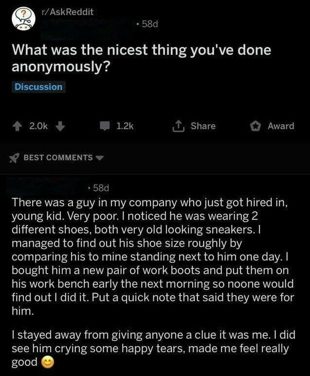 Once the woman in line in front of me at the grocery was removing foods that had been rung up because she didn’t have enough money for all she needed. I picked up the balance for her. I now watch for that and have helped a few. I also give hamburgers to panhandlers. Neither is quite anonymous, but close.