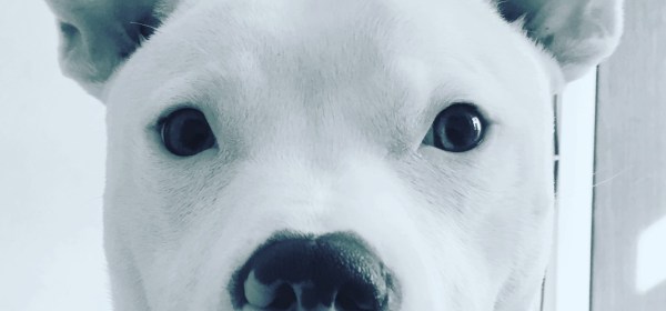 We brought Daisy home when she was 8-weeks old. A white Staffordshire bull-terrier puppy, with the softest fur, occasional faint blue/grey spots across her coat
